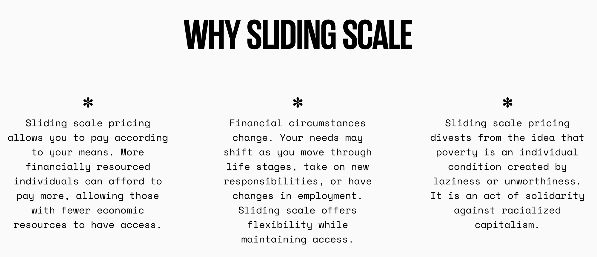 Particularly for services rather than physical goods, more costs are variable rather than fixed, meaning it's more possible to offer services at differing price points. If your normative commitment is to creating access to your services, then, sliding scale pricing is one vehicle for making that happen. It's not designed as a tool for profit maximization, and in that regard exists explicitly outside the standard model of economics that we've been taught is necessary for commerce.