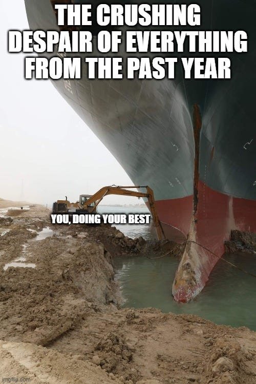 That's not to say that some of the other things The Internet™ claims are revolution—joy, rest, etc.—aren't important inputs for a healthy, fulfilling life, or even for revolutionary action. But at best they precede action. And the action part is what's missing from our current discourse. You cannot "be" revolution, but you can do revolution.