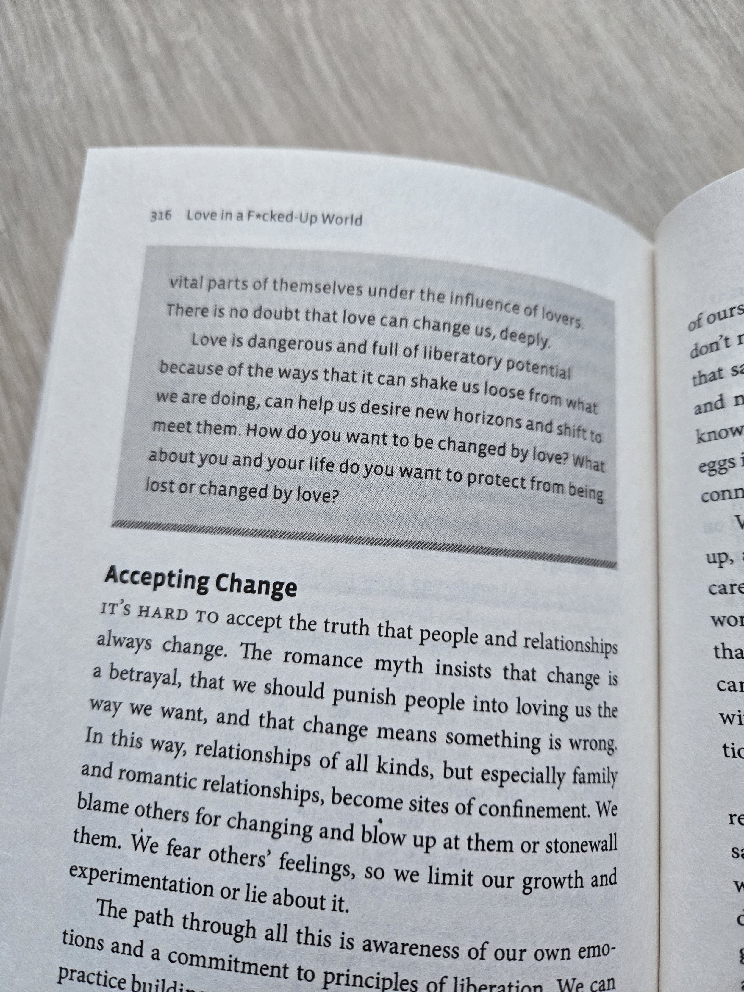But Spade's book is a gateway to other ways of thinking about our relationships and our communities, and a good entry point if you are new to frameworks that rethink the entire basis of society as we know it (think, Family Abolition). At the core of Love in a F*cked-Up World is the idea that if we want to witness change and participate in its creation, we need to think not only about our individual actions, but also about how we show up in relationships; how those relationships build or destroy the communities and groups we participate in; and how these groups operate as a constellation of relationships that already are the world we are building. This view of love is not idyllic or utopian—it's realistic, and ultimately pragmatic. Love—our drive to feel it and offer it, as well as its effects—is treated as inevitable, but not necessarily in the forms that we anticipate.